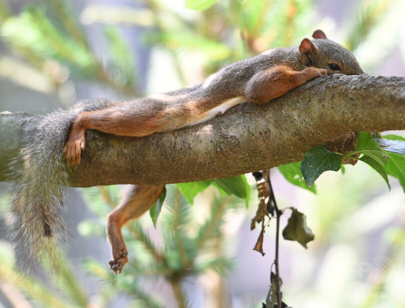同園のリスを撮影して6年になる都内在住の画家、折原キット(Kit Orihara)さん(50)は「季節ごとに異なる多彩な行動や表情が魅力。普段は巣箱で寝るリスが、暑さで警戒心もなく枝の上でうたた寝する様子も今ならでは」と話した。(c)AFPBB News