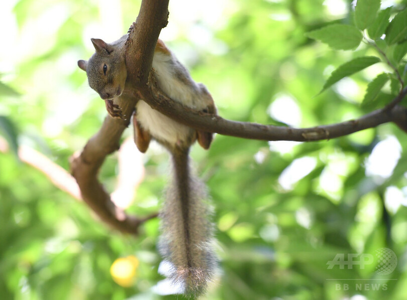 同園のリスを撮影して6年になる都内在住の画家、折原キット(Kit Orihara)さん(50)は「季節ごとに異なる多彩な行動や表情が魅力。普段は巣箱で寝るリスが、暑さで警戒心もなく枝の上でうたた寝する様子も今ならでは」と話した。(c)AFPBB News