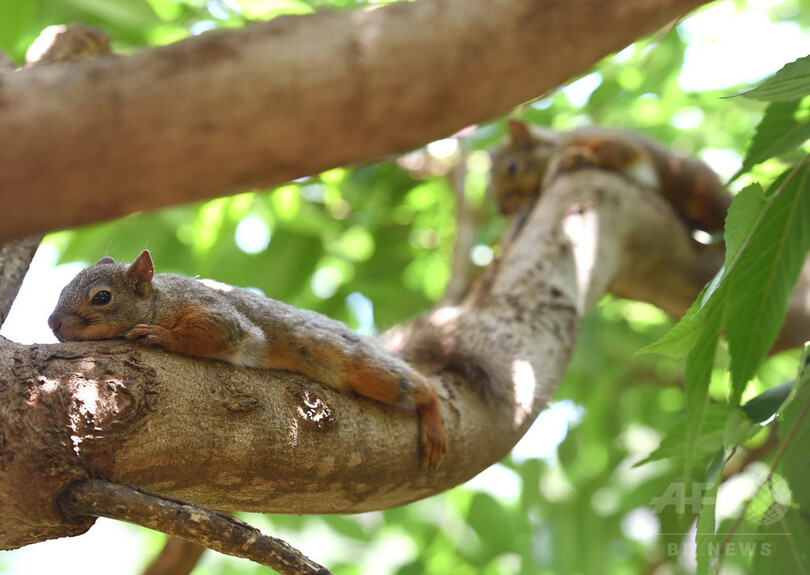 同園のリスを撮影して6年になる都内在住の画家、折原キット(Kit Orihara)さん(50)は「季節ごとに異なる多彩な行動や表情が魅力。普段は巣箱で寝るリスが、暑さで警戒心もなく枝の上でうたた寝する様子も今ならでは」と話した。(c)AFPBB News