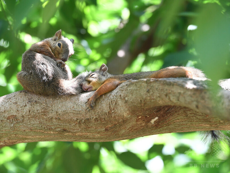 同園のリスを撮影して6年になる都内在住の画家、折原キット(Kit Orihara)さん(50)は「季節ごとに異なる多彩な行動や表情が魅力。普段は巣箱で寝るリスが、暑さで警戒心もなく枝の上でうたた寝する様子も今ならでは」と話した。(c)AFPBB News