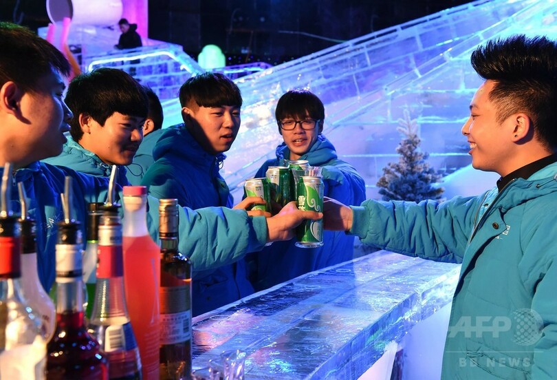 店内に着くと、まず分厚いダウンジャケットを手渡された。氷の椅子は先客で満席。外の燃えるような真夏の暑さとは打って変わり、ひんやりとした空気が漂っている。店内ではバーテンダーがカクテルを作る姿を眺めながら、友人たちと酒を飲みおしゃべりを楽しむ客で賑わっていた。(c)CNS/JCM/AFPBB News