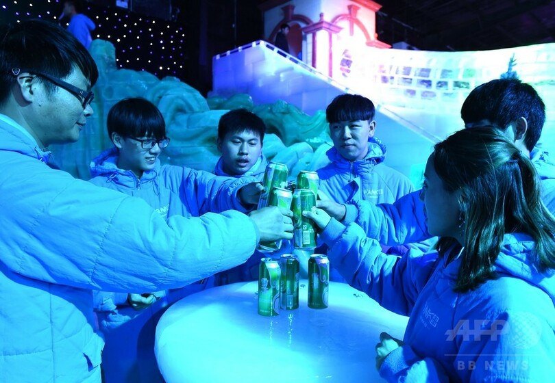 店内に着くと、まず分厚いダウンジャケットを手渡された。氷の椅子は先客で満席。外の燃えるような真夏の暑さとは打って変わり、ひんやりとした空気が漂っている。店内ではバーテンダーがカクテルを作る姿を眺めながら、友人たちと酒を飲みおしゃべりを楽しむ客で賑わっていた。(c)CNS/JCM/AFPBB News