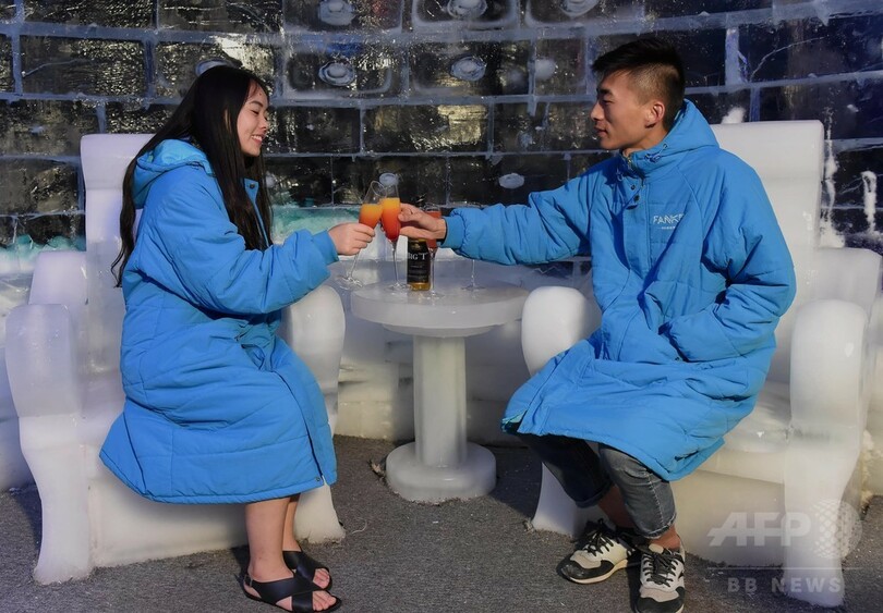 店内に着くと、まず分厚いダウンジャケットを手渡された。氷の椅子は先客で満席。外の燃えるような真夏の暑さとは打って変わり、ひんやりとした空気が漂っている。店内ではバーテンダーがカクテルを作る姿を眺めながら、友人たちと酒を飲みおしゃべりを楽しむ客で賑わっていた。(c)CNS/JCM/AFPBB News