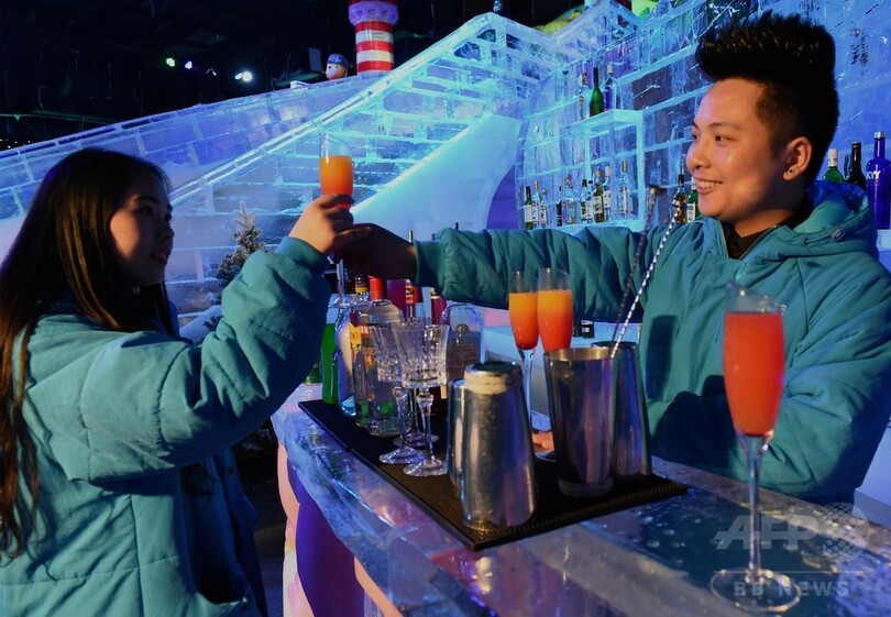 店内に着くと、まず分厚いダウンジャケットを手渡された。氷の椅子は先客で満席。外の燃えるような真夏の暑さとは打って変わり、ひんやりとした空気が漂っている。店内ではバーテンダーがカクテルを作る姿を眺めながら、友人たちと酒を飲みおしゃべりを楽しむ客で賑わっていた。(c)CNS/JCM/AFPBB News