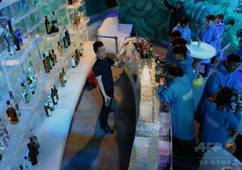 店内に着くと、まず分厚いダウンジャケットを手渡された。氷の椅子は先客で満席。外の燃えるような真夏の暑さとは打って変わり、ひんやりとした空気が漂っている。店内ではバーテンダーがカクテルを作る姿を眺めながら、友人たちと酒を飲みおしゃべりを楽しむ客で賑わっていた。(c)CNS/JCM/AFPBB News