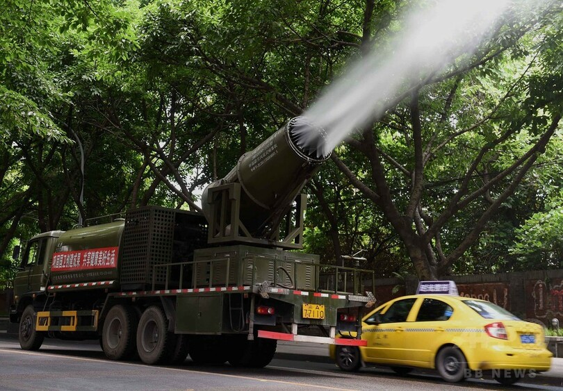 【7月24日 CNS】高温が続く中国・重慶市(Chongqing)九竜坡区(Jiulongpo)新華七村(Xinhuaqi)の路上で20日、大砲の形によく似た大型車両が大量の水煙を噴出していた。新型エコ集塵風式噴霧機だという。