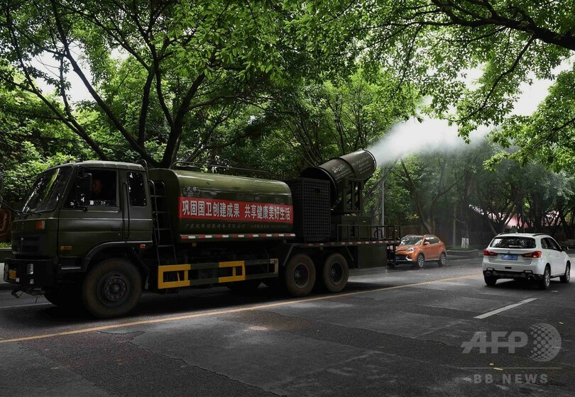 【7月24日 CNS】高温が続く中国・重慶市(Chongqing)九竜坡区(Jiulongpo)新華七村(Xinhuaqi)の路上で20日、大砲の形によく似た大型車両が大量の水煙を噴出していた。新型エコ集塵風式噴霧機だという。
