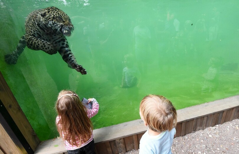 【7月22日 AFP】フランス南西部ボルドー(Bordeaux)郊外のペサック動物園(Pessac Zoo)では、それぞれ2歳と1歳のジャガー「カタリナ(Catalina)」と「マト(Mato)」が公開されている。この2頭は欧州で最初に公開されたジャガーで、飼育舎には容積約100立方メートルのプールがあり、来場者はジャガーの水中での捕食能力も見ることができる。(c)AFP