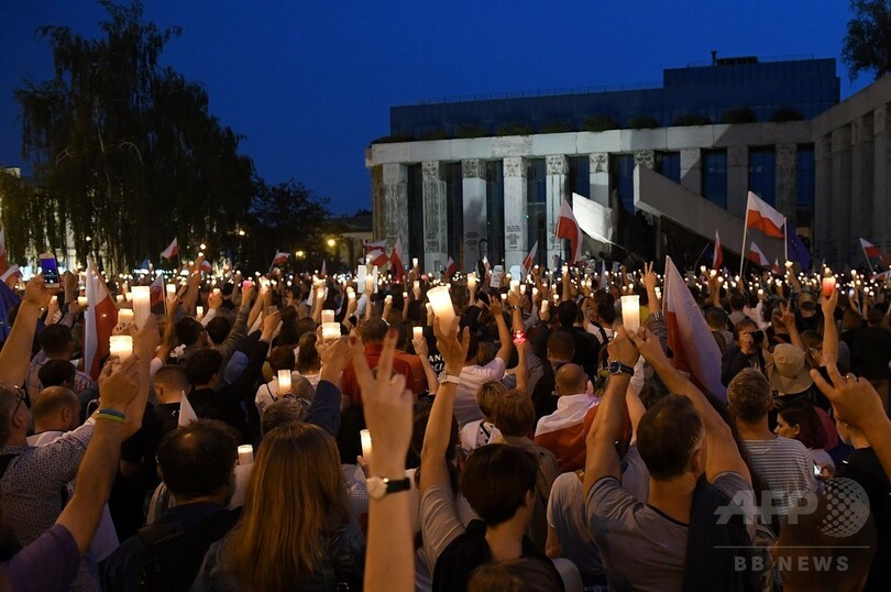 【7月24日 AFP】ポーランドの首都ワルシャワ(Warsaw)で23日、政府が推進する司法制度改革に反対する大勢の市民がろうそくを手に大規模な抗議デモを行った。人々は最高裁判所や大統領府の前で「憲法、憲法!」と叫び、最高裁判所に対する政府の監督権限を強化する新法を承認しないようアンジェイ・ドゥダ(Andrzej Duda)大統領に拒否権の発動を強く求めた。