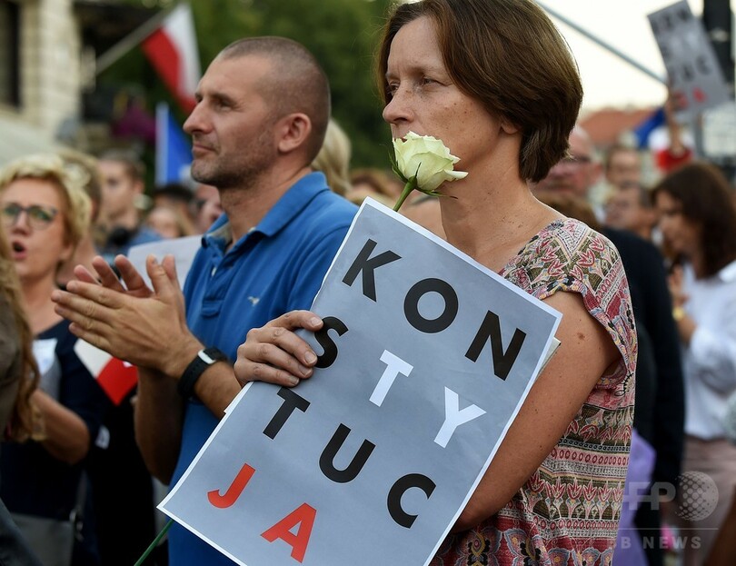 【7月24日 AFP】ポーランドの首都ワルシャワ(Warsaw)で23日、政府が推進する司法制度改革に反対する大勢の市民がろうそくを手に大規模な抗議デモを行った。人々は最高裁判所や大統領府の前で「憲法、憲法!」と叫び、最高裁判所に対する政府の監督権限を強化する新法を承認しないようアンジェイ・ドゥダ(Andrzej Duda)大統領に拒否権の発動を強く求めた。