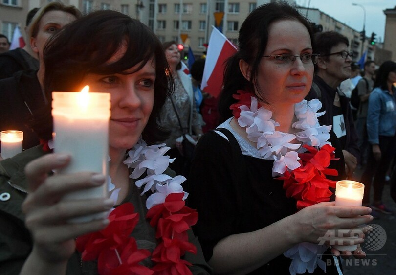 【7月24日 AFP】ポーランドの首都ワルシャワ(Warsaw)で23日、政府が推進する司法制度改革に反対する大勢の市民がろうそくを手に大規模な抗議デモを行った。人々は最高裁判所や大統領府の前で「憲法、憲法!」と叫び、最高裁判所に対する政府の監督権限を強化する新法を承認しないようアンジェイ・ドゥダ(Andrzej Duda)大統領に拒否権の発動を強く求めた。