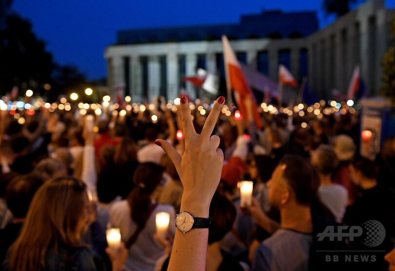 【7月24日 AFP】ポーランドの首都ワルシャワ(Warsaw)で23日、政府が推進する司法制度改革に反対する大勢の市民がろうそくを手に大規模な抗議デモを行った。人々は最高裁判所や大統領府の前で「憲法、憲法!」と叫び、最高裁判所に対する政府の監督権限を強化する新法を承認しないようアンジェイ・ドゥダ(Andrzej Duda)大統領に拒否権の発動を強く求めた。