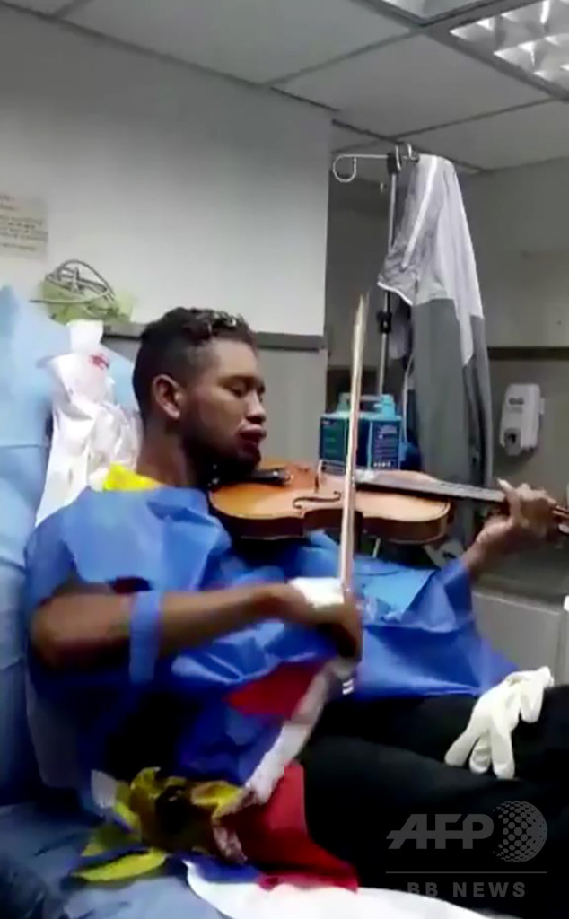 【7月24日 AFP】辺りには息ができないほど催涙ガスが充満し、放水銃が放たれている混沌(こんとん)とした路上にベネズエラ国旗と同じ赤、青、黄色のシャツを着たやせた男性が、勇敢にも独りでたたずみ、バイオリンを弾き始める。演奏するのは国歌やベネズエラの伝統音楽だ。