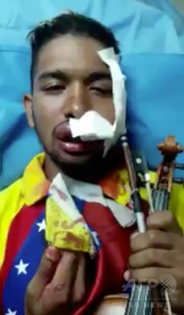 【7月24日 AFP】辺りには息ができないほど催涙ガスが充満し、放水銃が放たれている混沌(こんとん)とした路上にベネズエラ国旗と同じ赤、青、黄色のシャツを着たやせた男性が、勇敢にも独りでたたずみ、バイオリンを弾き始める。演奏するのは国歌やベネズエラの伝統音楽だ。