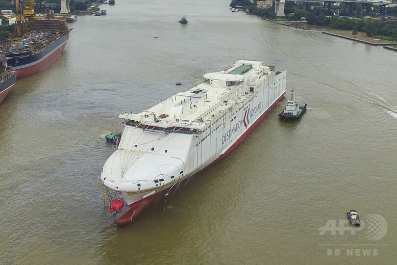 この豪華客船は、全長198.54メートル、幅25.2メートルで、航海速力28.5ノット、旅客定員は1600人。車両甲板は2層、520台余りの乗用車を積載できる。天然ガスと重油を使用し、メインエンジンには可変ピッチプロペラを採用している。(c)CNS/JCM/AFPBB News