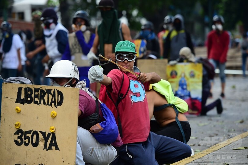 一連のデモでは26日、同国西部で抗議活動中の男性(30)が銃撃を受け死亡したほか、検察当局によると首都カラカス(Caracas)で起きた衝突で少年(16)が死亡。死者は合わせて105人になった。(c)AFP/Maria Isabel SANCHEZ