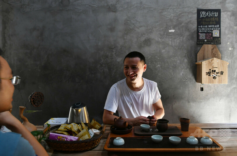 アートな雰囲気が漂うこのシェアスペースは誰でも利用でき、すべてセルフサービス。シェアスペースの発起人の邵東強(Shao Dongqiang)さんは、「ここでは、自分でお湯を沸かしてお茶をいれたり、ちょっと本を手に取って読んだり、メッセージノートに今の気持ちをつづったり。ただ座ってボーッとすごしてもいい、完全に自由な空間」と話す。(c)CNS/JCM/AFPBB News
