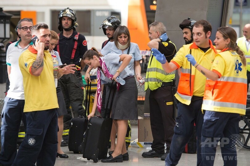 【7月28日 AFP】(更新、写真追加)スペイン第2の都市、バルセロナ(Barcelona)中心部の駅で28日朝、通勤客で混みあう時間帯に列車がホームの端に衝突し、54人が負傷した。救急当局が明らかにした。