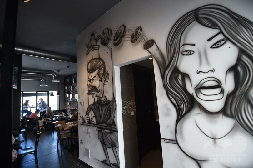 レンガ造りの店内は刑務所のような雰囲気だ。鉄格子が設置された壁には、あらゆる独裁者の肖像画が飾られている。アドルフ・ヒトラー(Adolf Hitler)に変装したチャーリー・チャップリン(Charlie Chaplin)、壁のスペースを奪い合うかのように並ぶ旧ソ連の独裁者ヨシフ・スターリン(Joseph Stalin)とメラニア・トランプ(Melania Trump)米大統領夫人。ロシア大統領のウラジーミル・プーチン(Melania Trump)氏の肖像も、壁の上から店内を見下ろしている。