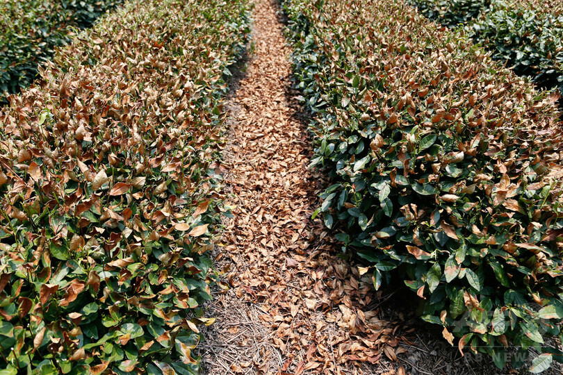杭州市では、猛暑が続いた影響で、「西湖龍井茶(Xihu Longjing)」一級保護区内のいくつかの特定品種と、樹齢がまだ短く、根が浅い茶樹などに、程度が異なる葉焼けの被害が見つかった。(c)CNS/JCM/AFPBB News