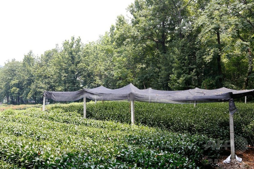 杭州市では、猛暑が続いた影響で、「西湖龍井茶(Xihu Longjing)」一級保護区内のいくつかの特定品種と、樹齢がまだ短く、根が浅い茶樹などに、程度が異なる葉焼けの被害が見つかった。(c)CNS/JCM/AFPBB News