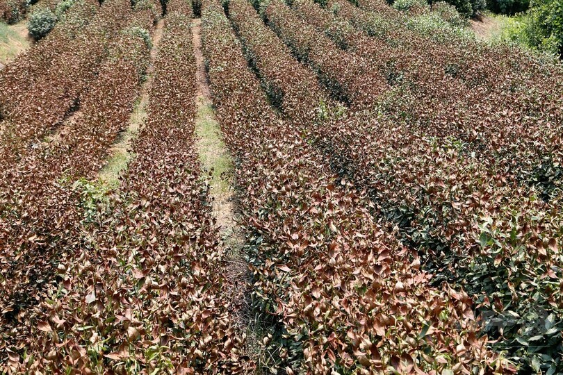 杭州市では、猛暑が続いた影響で、「西湖龍井茶(Xihu Longjing)」一級保護区内のいくつかの特定品種と、樹齢がまだ短く、根が浅い茶樹などに、程度が異なる葉焼けの被害が見つかった。(c)CNS/JCM/AFPBB News