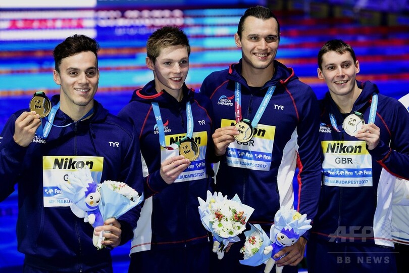 男子4×200メートル自由形リレーでは、最終泳者のジェームス・ガイ(James Guy)が力強い泳ぎをみせた英国が金メダルを獲得し、ロシアが銀メダル、米国が銅メダルに輝いた。(c)AFP