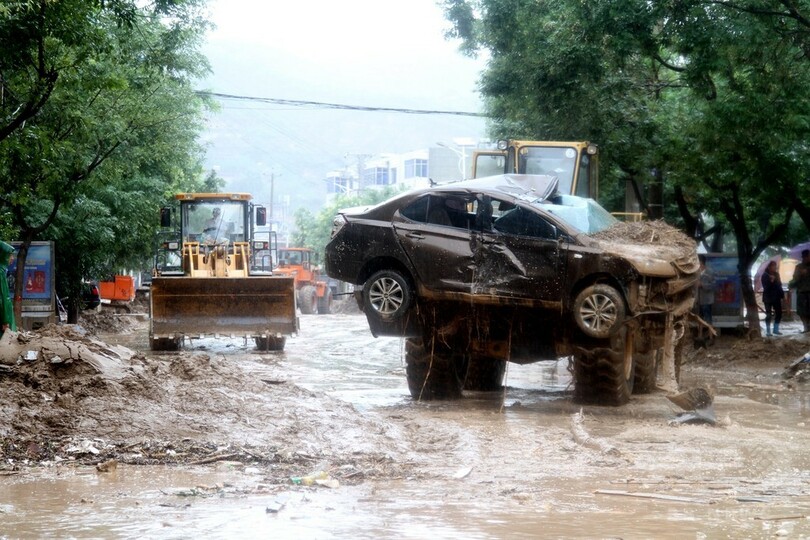災害発生時、綏徳県の橋は10か所以上が漫水し、旧市街では最大4メートルの浸水が確認された。特に被害が大きかった西山街(Xishanjie)などの地域では、排水や汚泥、損傷した車などを現場から撤去する作業が行われている。(c)CNS/JCM/AFPBB News