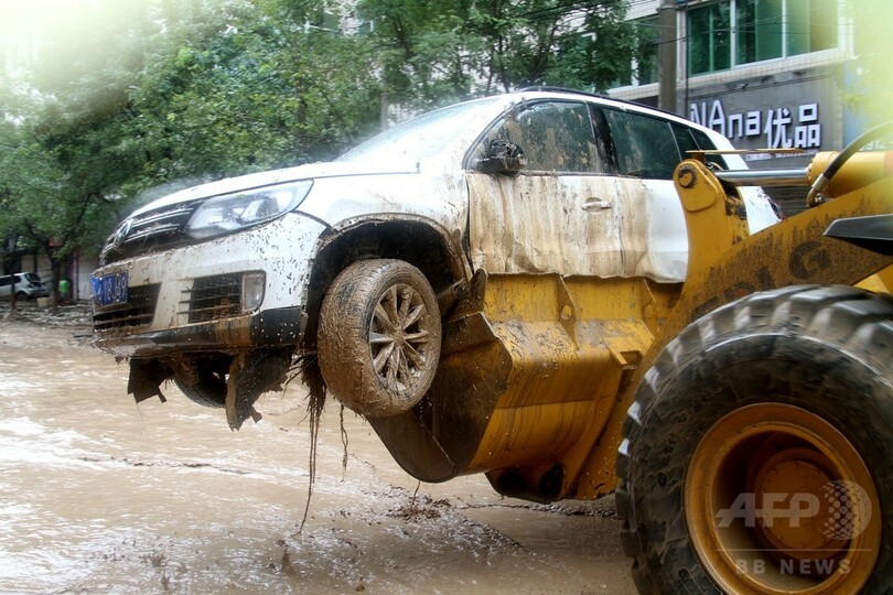 災害発生時、綏徳県の橋は10か所以上が漫水し、旧市街では最大4メートルの浸水が確認された。特に被害が大きかった西山街(Xishanjie)などの地域では、排水や汚泥、損傷した車などを現場から撤去する作業が行われている。(c)CNS/JCM/AFPBB News