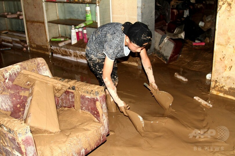 災害発生時、綏徳県の橋は10か所以上が漫水し、旧市街では最大4メートルの浸水が確認された。特に被害が大きかった西山街(Xishanjie)などの地域では、排水や汚泥、損傷した車などを現場から撤去する作業が行われている。(c)CNS/JCM/AFPBB News