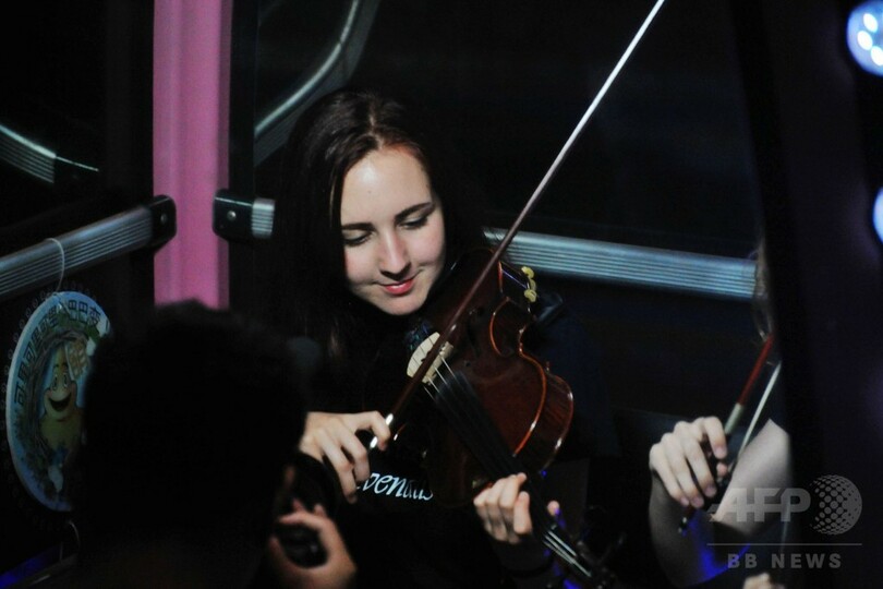青島西海岸新区の海上嘉年華にある観覧車のイルミネーションに明かりが灯るころ、観覧車のゴンドラ内にはさまざまな楽器を持った人々がこっそりと乗り込んだ。スロバキアから来訪中のしたコシツェ・フィルハーモニー管弦楽団(Kosice State Philharmonic)と北京八中(Beijing No.8 High School)金帆(Jinfan)交響楽団などの若手音楽家が集結し、観覧車オーケストラの旅に出た。(c)CNS/JCM/AFPBB News