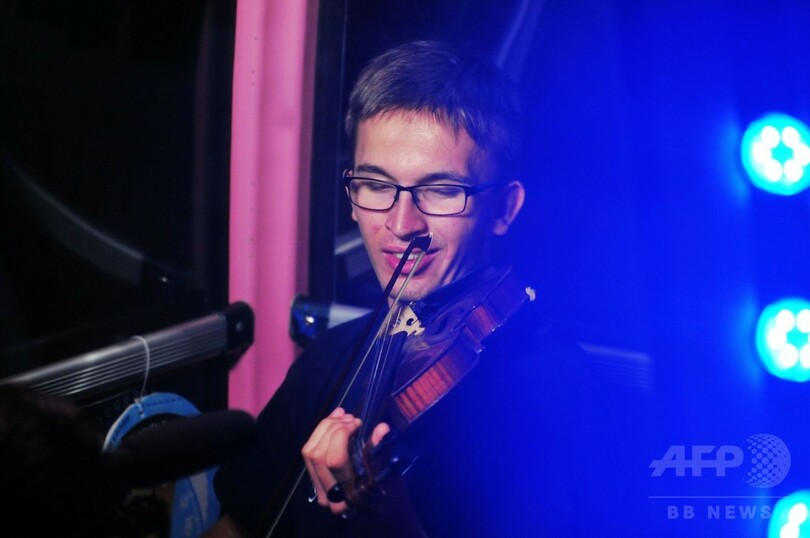 青島西海岸新区の海上嘉年華にある観覧車のイルミネーションに明かりが灯るころ、観覧車のゴンドラ内にはさまざまな楽器を持った人々がこっそりと乗り込んだ。スロバキアから来訪中のしたコシツェ・フィルハーモニー管弦楽団(Kosice State Philharmonic)と北京八中(Beijing No.8 High School)金帆(Jinfan)交響楽団などの若手音楽家が集結し、観覧車オーケストラの旅に出た。(c)CNS/JCM/AFPBB News