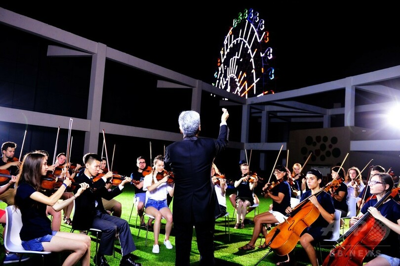 【8月7日 CNS】中国・青島(Qingdao)西海岸で、観覧車のゴンドラ内でオーケストラが演奏をするイベントが開催された。