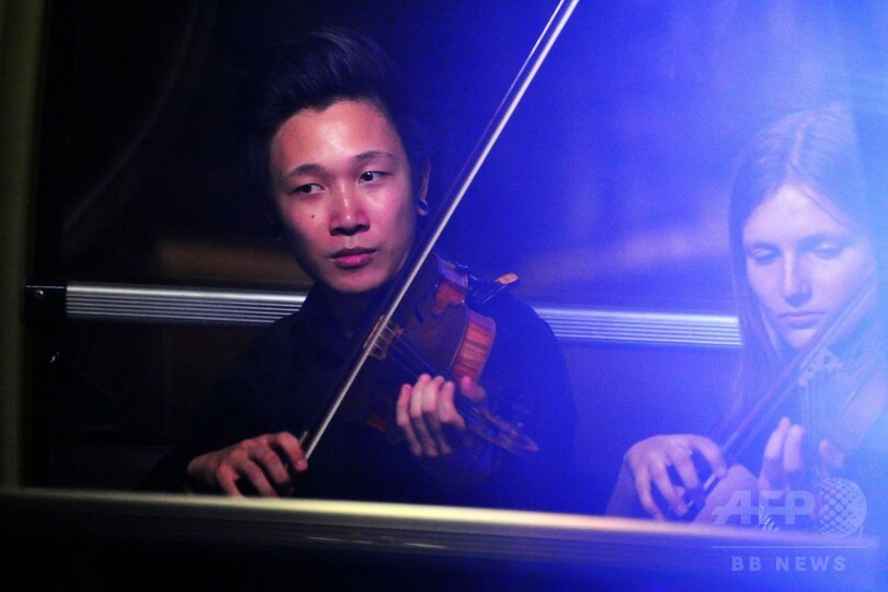 青島西海岸新区の海上嘉年華にある観覧車のイルミネーションに明かりが灯るころ、観覧車のゴンドラ内にはさまざまな楽器を持った人々がこっそりと乗り込んだ。スロバキアから来訪中のしたコシツェ・フィルハーモニー管弦楽団(Kosice State Philharmonic)と北京八中(Beijing No.8 High School)金帆(Jinfan)交響楽団などの若手音楽家が集結し、観覧車オーケストラの旅に出た。(c)CNS/JCM/AFPBB News