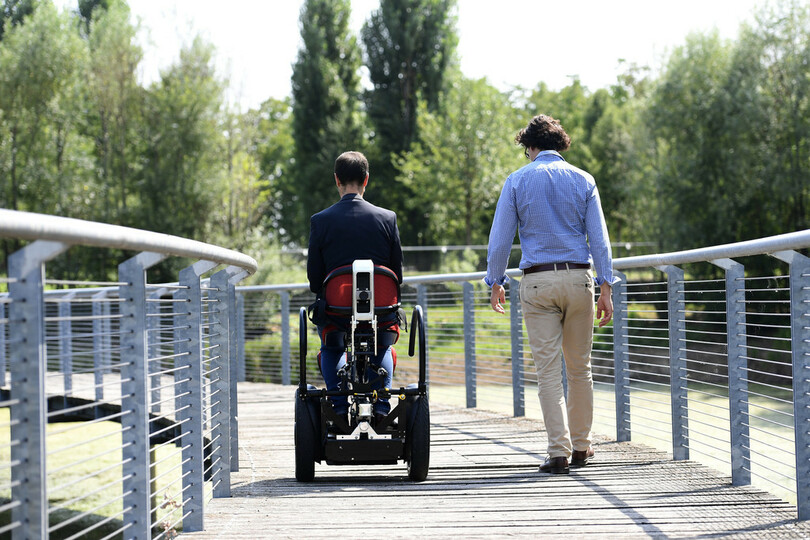 ビジェンティーニさんは、電動立ち乗り二輪車「セグウェイ(Segway)」から着想を得て、中腰の高さで利用でき、手を使わずに操作できる車いす「マリオウェイ(MarioWay)」を開発した。座面の位置を高くしたことで、「マリオウェイ」の使用者はバーのカウンターで飲み物を頼んだり、棚の高い場所から本を取り出したりできる。