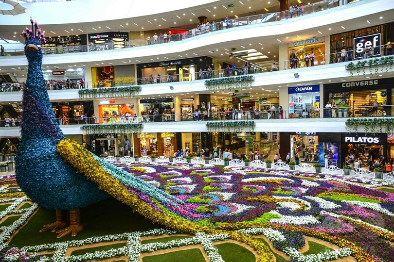 18万本の花でできた巨大なクジャク像、コロンビアで「花の祭典」