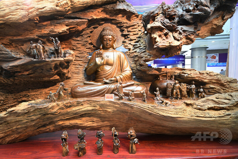 この樹根彫刻は長さ4.4メートル、高さ2.7メートル、厚さ1メートル。10人の彫刻家によって1年間かけて完成した作品だ。(c)CNS/JCM/AFPBB News