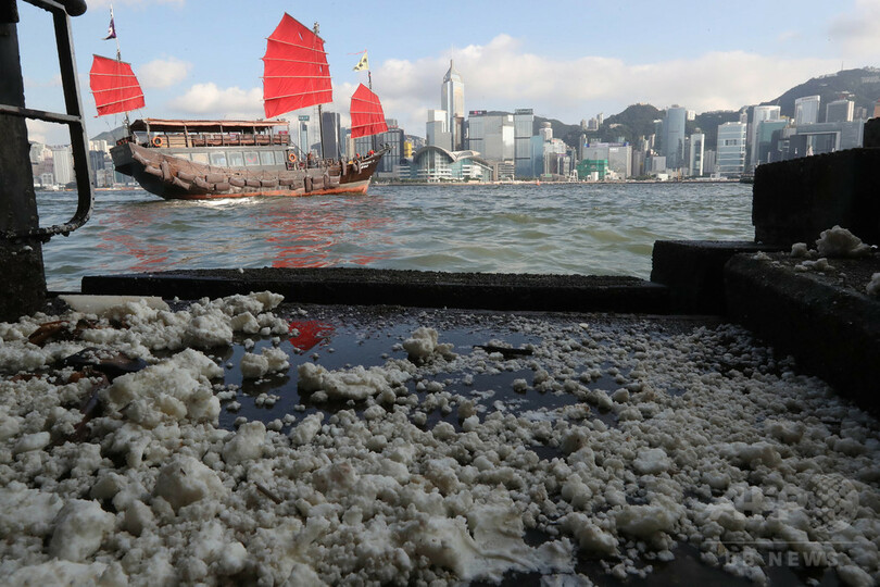 【8月7日 AFP】(写真追加)香港(Hong Kong)で6日、中国の海域で発生した船舶衝突事故によりパーム油が流出したことを受け、10か所のビーチが閉鎖された。