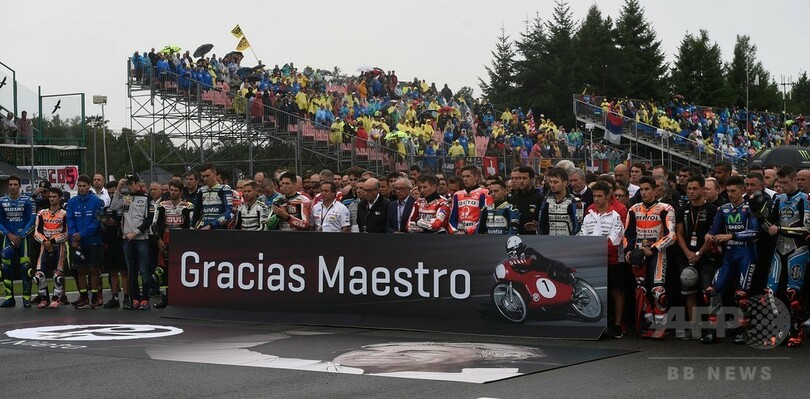 この日のレースの前には、前カテゴリーのチームとライダーが「ありがとうマエストロ」と書かれた看板の後ろに集結し、ニエト氏を悼んで1分間の黙とうをささげた。(c)AFP