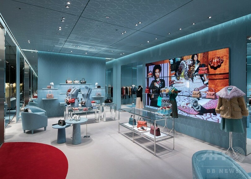 同店は、世界中の「ミュウミュウ」ショップで行われているストアデザインの改装にあわせ、アイコニックなゴールドからペールブルーの内装へと一新。外観には波打つメタル素材のカーテンを一面に配し、広々とした店内にはガラステーブルやレッドのソファーがディスプレイされ、モダンでありながらもフェミニンかつ親しみのある空間に仕上げられた。