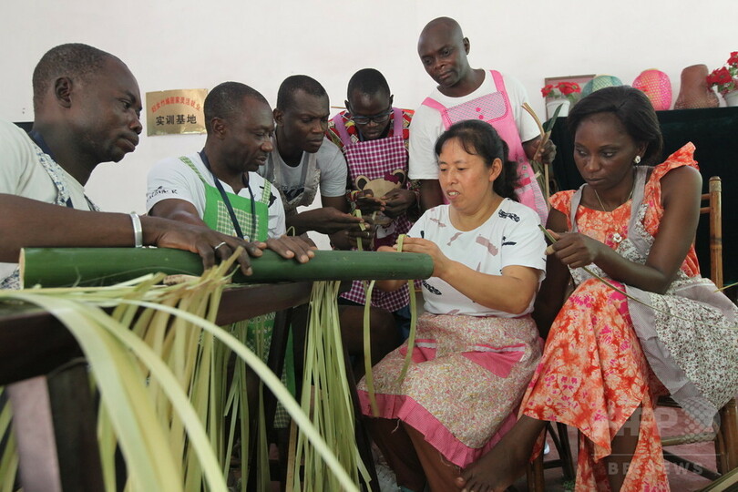 【8月18日 CNS】中国・四川省(Sichuan)眉山市(Meishan)青神県(Qingshen)にある竹編み芸術の郷「国際竹芸城」で、中央アフリカ共和国出身の24人の学生たちが、地元の専門家の指導の下、竹細工の作り方を学んでいる。7月下旬から、50日間の竹編み技術学習トレーニングに参加している。(c)CNS/JCM/AFPBB News