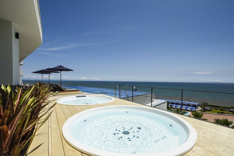 “日常から解放されたゆらぎの旅”をコンセプトに、温泉や海と一体化した感覚を味わえるインフィニティプール、プライベートスパ、サウナなどを用意した「サーマル スパ エス ウェーブ」。1階にはホテルフロントとレストラン・バー「エス ダイニング」があり、湘南の海を一望できる温泉・スパを3、4階に備える。