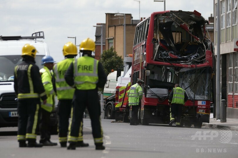 ロンドン名物2階建てバス、道路脇の店に突っ込み10人負傷