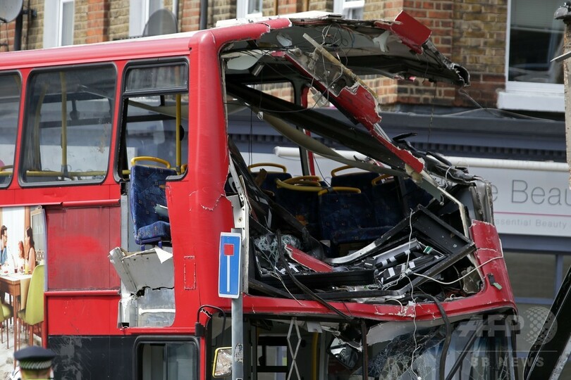 ロンドン名物2階建てバス、道路脇の店に突っ込み10人負傷