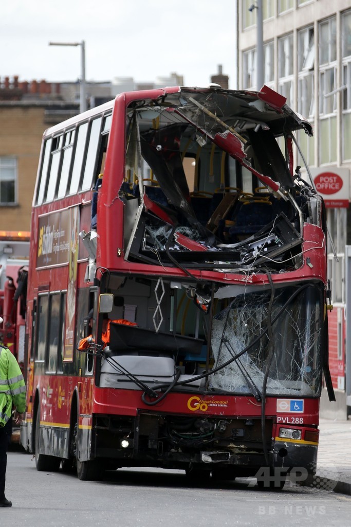 ロンドン名物2階建てバス、道路脇の店に突っ込み10人負傷