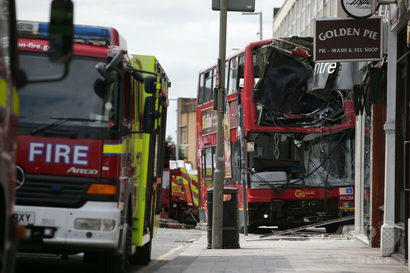 ロンドン名物2階建てバス、道路脇の店に突っ込み10人負傷