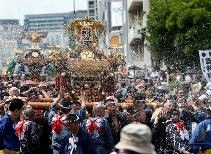 【8月14日 AFP】東京都江東区の富岡八幡宮周辺で13日、江戸三大祭りの一つ、深川八幡祭り(Fukagawa Hachiman Festival)の連合渡御(とぎょ)が行われた。たくさんのみこしが練り歩くなか、みこしの担ぎ手たちには清めの水が豪快に掛けられた。(c)AFP