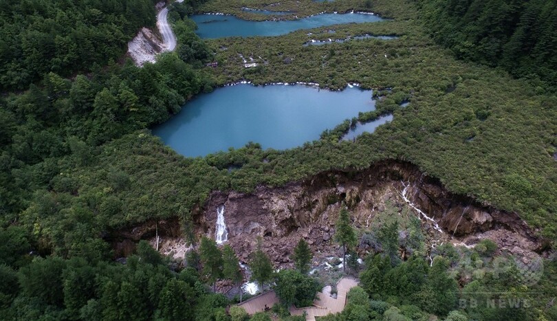 【8月15日 CNS】中国・四川省(Sichuan)九寨溝(Jiuzhaigou)で起こった「8.8」地震により、九寨溝景勝地区内の「火花海(Huohuahai)」、「諾日朗(Nuorilang)の滝」、「箭竹海(Jianzhuhai)」などの観光名所が被害を受けた。特に有名なスポットのひとつ「火花海」は水が流れ出し、湖底が見えている。池の周辺では土砂崩れも見られ、水面は濁っている。