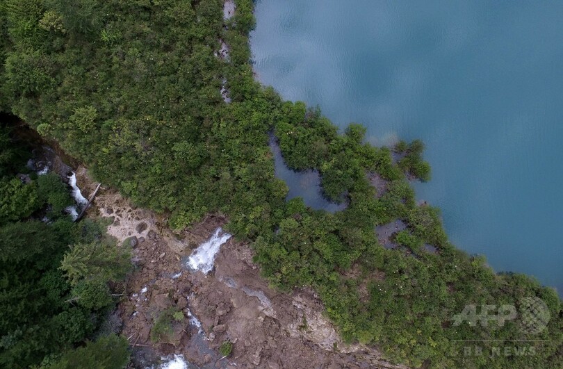 四川省政府新聞弁公室が9日に発表したところによれば、九寨溝景勝地区の「火花海」は地震により裂け目ができ、池の水がすべて流れ出してしまったが、決壊の危険性はないという。(c)CNS/JCM/AFPBB News