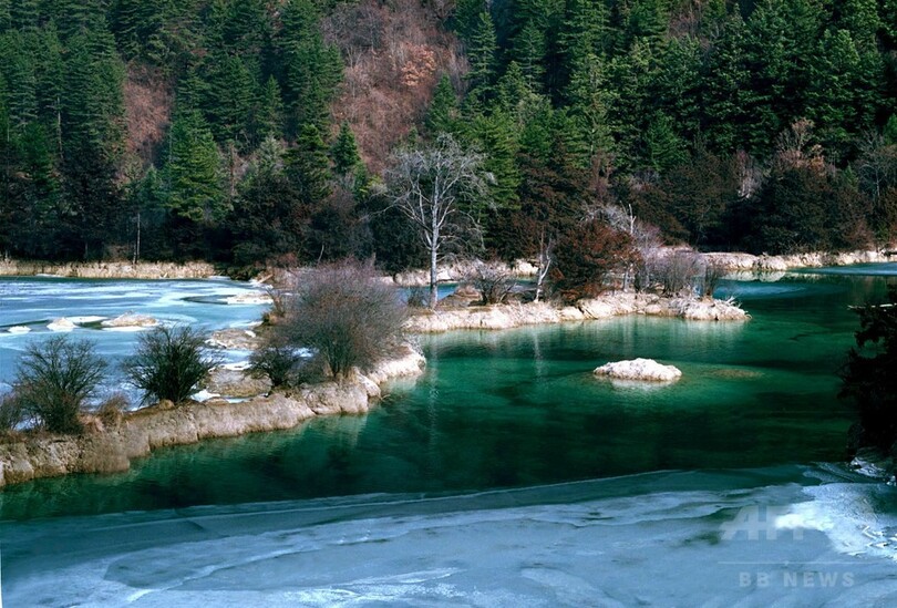 四川省政府新聞弁公室が9日に発表したところによれば、九寨溝景勝地区の「火花海」は地震により裂け目ができ、池の水がすべて流れ出してしまったが、決壊の危険性はないという。(c)CNS/JCM/AFPBB News